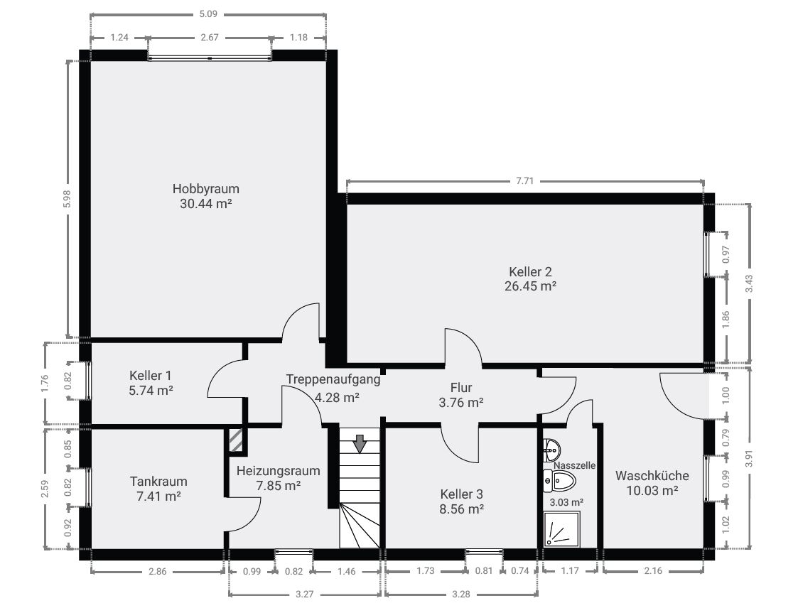 Das Untergeschoss überrascht mit einem vielseitig nutzbaren Hobby- oder Gästezimmer, das über ein eigenes Duschbad verfügt. Ergänzt wird die Etage durch den Heizungsraum, einen großzügigen Waschraum mit Platz für Waschmaschine und Trockner sowie mehrere Abstellräume. Auch der Einbau einer Sauna ist hier problemlos möglich.