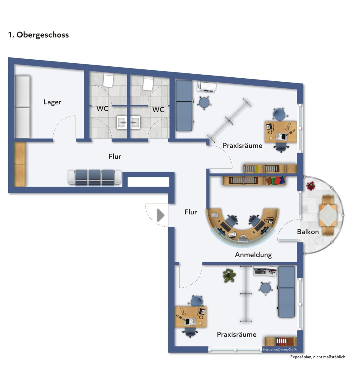 •1. Obergeschoss: ca. 68 m², vermietete Büroeinheit mit einem Stellplatz mit einer Jahreskaltmiete von 5.760,00 € p.a. – stabile Einnahmen ab dem ersten Tag.