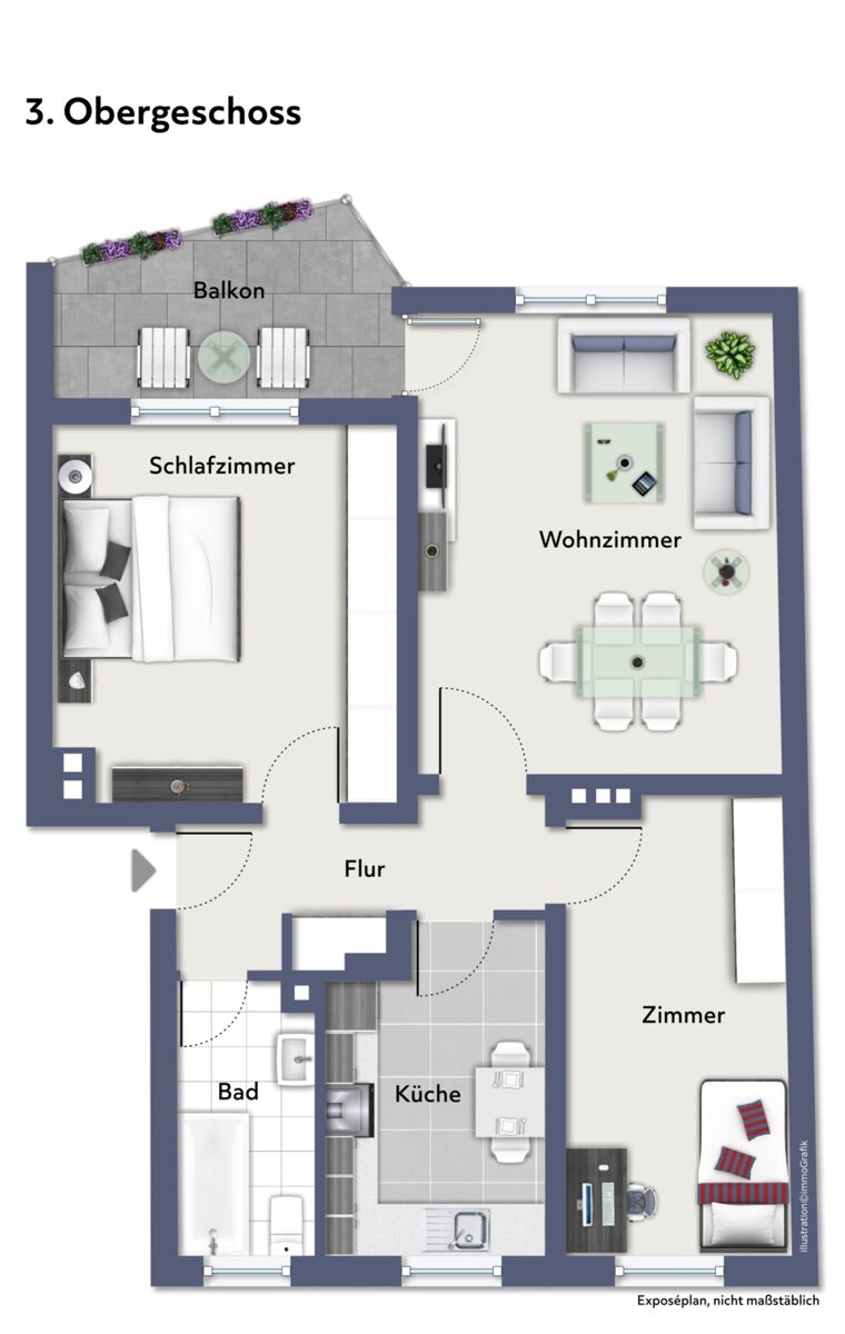 Ein durchdachter Grundriss mit drei gut nutzbaren Zimmern, ein Tageslichtbad sowie ein Balkon sorgen für eine angenehme Wohnqualität. Die ruhige Lage innerhalb der Wohnanlage sowie die Etage im 3. Obergeschoss bieten eine helle und freundliche Wohnatmosphäre.