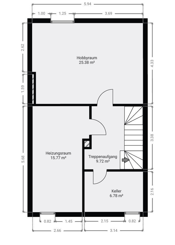 Zusätzlichen Platz finden Sie im Keller: Hier stehen Ihnen ein ca. 25 m² großer Hobbyraum, der Heizungsraum sowie ein weiterer Abstellraum zur Verfügung.