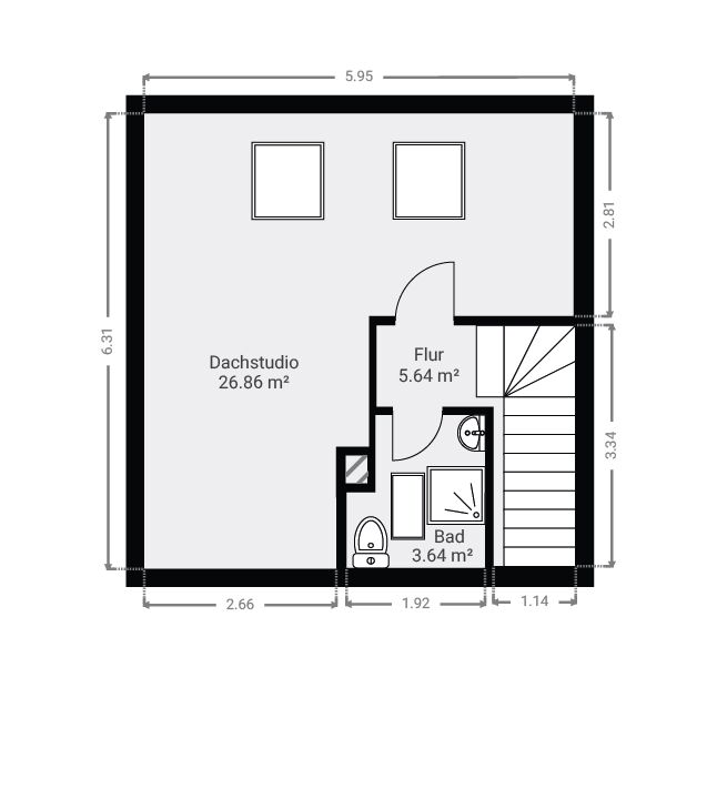 Das Dachgeschoss bietet ein großzügiges Dachstudio mit ca. 25 m² Wohnfläche sowie ein weiteres Bad mit Dusche und WC, ideal als Elternbereich, Homeoffice oder Rückzugsort für Teenager.