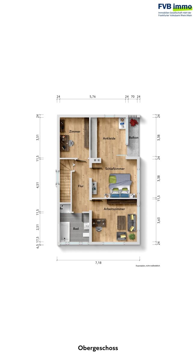Im Obergeschoss befinden sich drei gut geschnittene Schlafzimmer, davon eines mit separatem Ankleidezimmer und Zugang zum Balkon. Ebenfalls im Obergeschoss steht ein Duschbad zur Verfügung.