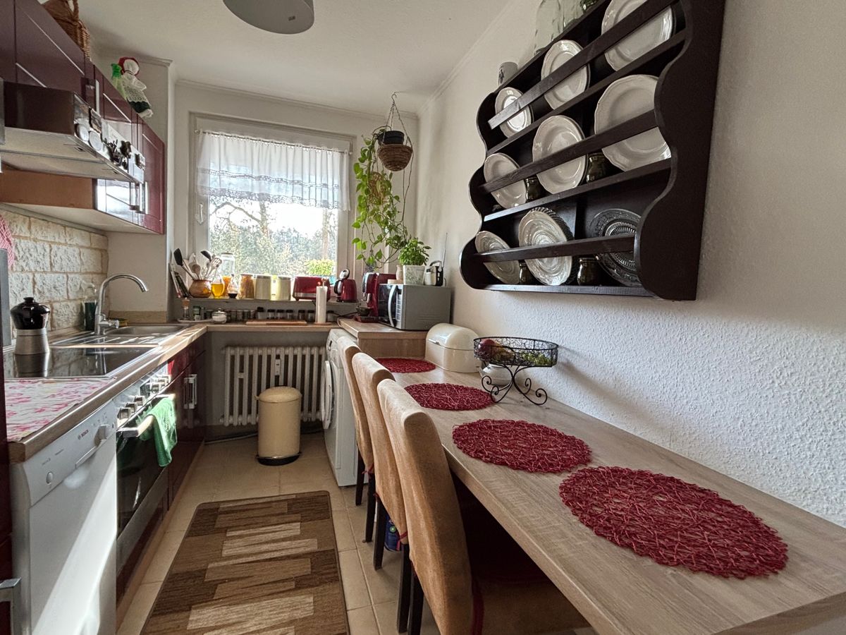 Das innenliegende Badezimmer ist mit einer Badewanne ausgestattet und sorgt für entspannte Wohlfühlmomente nach einem langen Tag. Die bereits vorhandene Einbauküche ermöglicht Ihnen einen komfortablen Start in den Alltag – einfach einziehen und loskochen. Ein weiteres Highlight ist der Balkon, auf dem Sie die Lage am Waldrand genießen können – umgeben von viel Grün, fernab vom Trubel, aber dennoch gut angebunden.