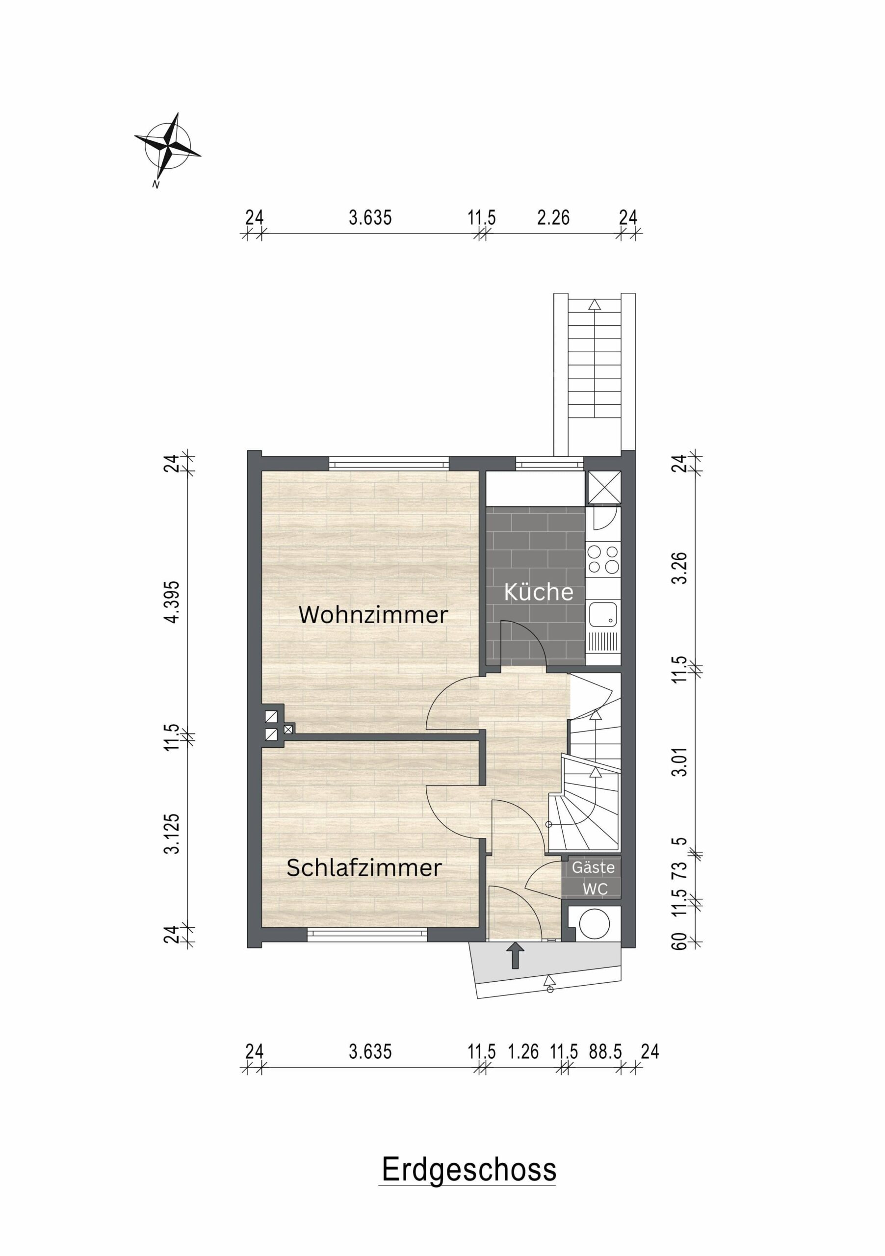 Das Erdgeschoss überzeugt mit einer funktionalen Aufteilung: Das Wohnzimmer bildet den zentralen Lebensmittelpunkt, ergänzt durch ein weiteres Zimmer, das flexibel als Schlaf-, Gäste- oder Arbeitszimmer genutzt werden kann. Ein vorhandener Kamin entspricht aktuell nicht mehr den geltenden gesetzlichen Vorschriften und müsste im Zuge einer Nutzung erneuert oder angepasst werden.