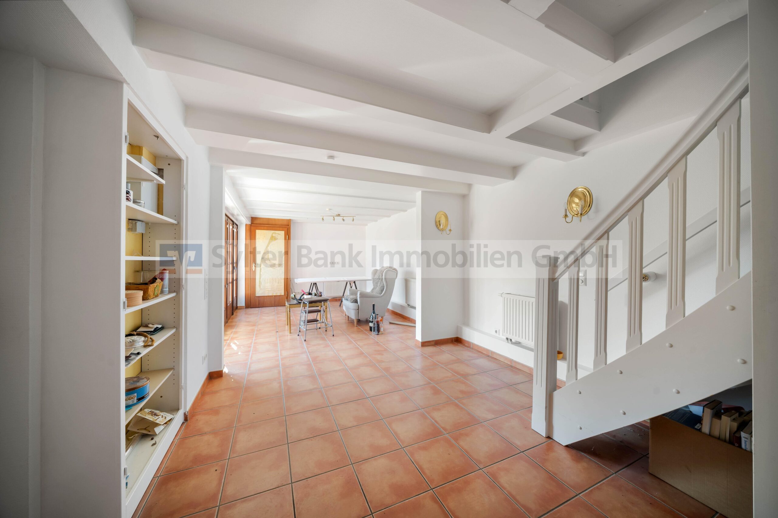 Im Erdgeschoss befinden sich die Küche mit praktischem Vorratsraum, ein Tageslichtbad sowie zwei helle Wohnbereiche. Von einem der Wohnbereiche gelangen Sie direkt auf die großzügige Südterrasse über zwei Ebenen – ideal für sonnige Nachmittage oder entspannte Abende im Freien.