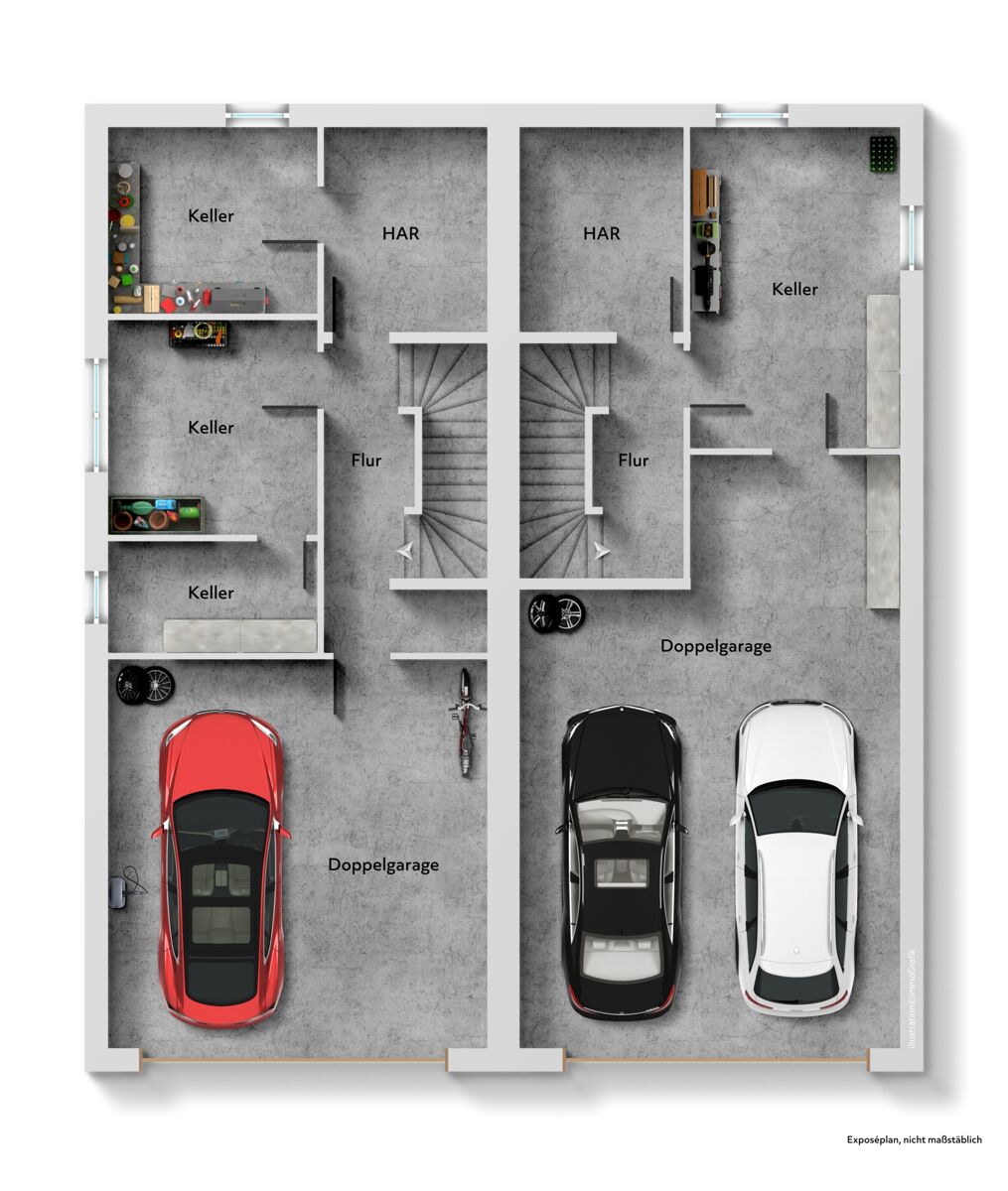 Das Untergeschoss umfasst mehrere Abstellräume, den Technikraum mit Platz für Wärmepumpe, Waschmaschine und Trockner, sowie eine großzügige Doppelgarage mit elektrisch betriebenem Sektionaltor und Fernbedienung. Davor befinden sich noch zwei Pkw-Stellplätze.