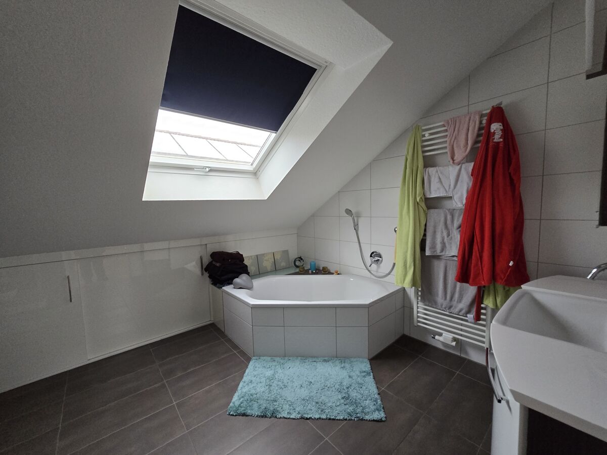 Das Tageslichtbad verfügt sowohl über eine Badewanne als auch über eine Dusche und bietet durch seine Größe und die vorhandenen Ablagemöglichkeiten viel Komfort im Alltag.