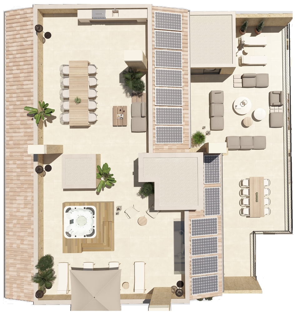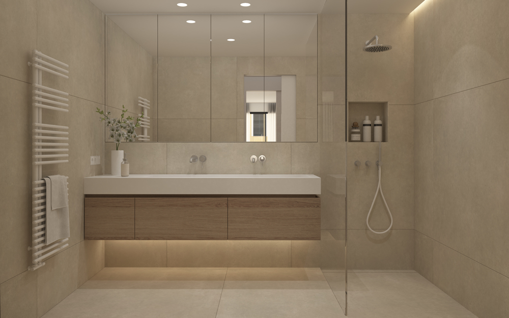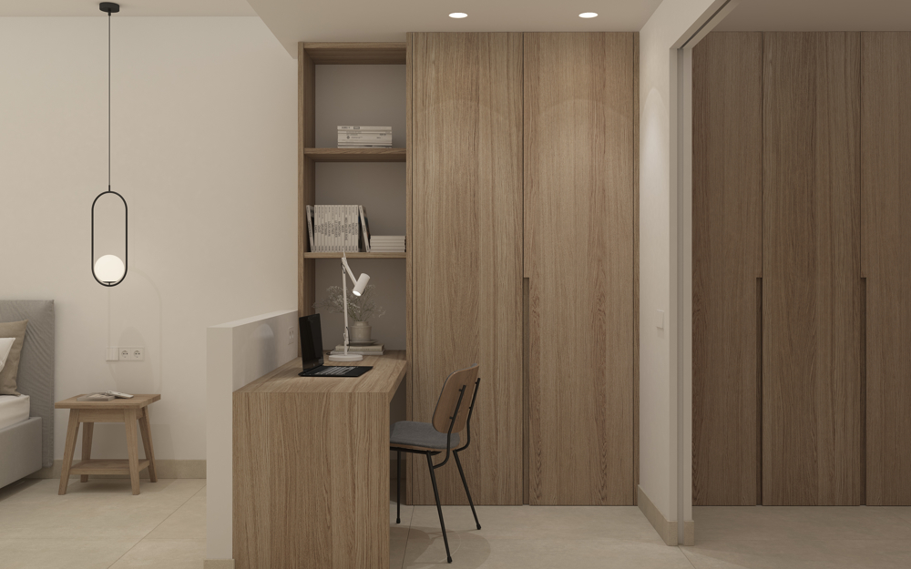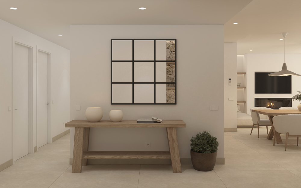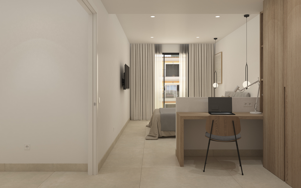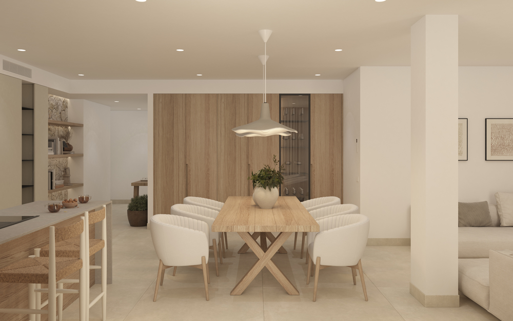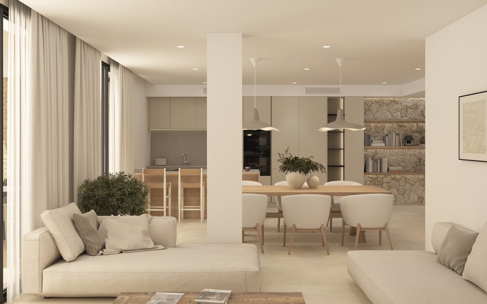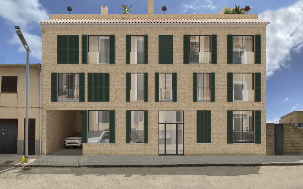 Am Stadtrand des bezaubernden Städtchens Artà entsteht auf einem ca. 458 m² großen Grundstück der Neubau eines Stadthauses mit insgesamt 5 Wohneinheiten. Das Neubauprojekt zeichnet sich nicht nur durch eine ruhige und für die Insel authentische Lage aus, sondern besticht durch eine optisch charmante und ebenfalls authentische Bauweise und Architektur. Diese geräumige Wohneinheit befindet sich im 1. Obergeschoss des Gebäudes auf der rechten Seite, die Wohnfläche beträgt ca. 107 m². Die moderne und hochwertig ausgestattete Wohnung verfügt über 2 Bäder und 2 Schlafzimmer, beide Schlafzimmer besitzen ein Bad en suite, eines davon mit zusätzlichem Ankleidebereich, sowie ein Gäste-WC. Diese Wohnung bietet einen großzügigen Wohn-/Essbereich und eine zauberhafte Terrasse. Die Balkonfläche weist insgesamt ca. 9 m² aus. Ebenfalls besonders ist die haustechnische Ausstattung, die einem modernsten Standard entspricht. Eine Photovoltaikanlage für den Allgemeinstrom, eine Zentralheizung über Wärmepumpen, Verglasungen der Klasse A3 als auch Wallboxen für E-Fahrzeuge sind die Elemente, die ein innovatives und nachhaltiges Wohnen gewährleisten. Eine Tiefgarage bietet ausreichend PKW-Stellplätze, zu erreichen ist diese sowie die einzelnen Wohnebenen über einen Personenaufzug.