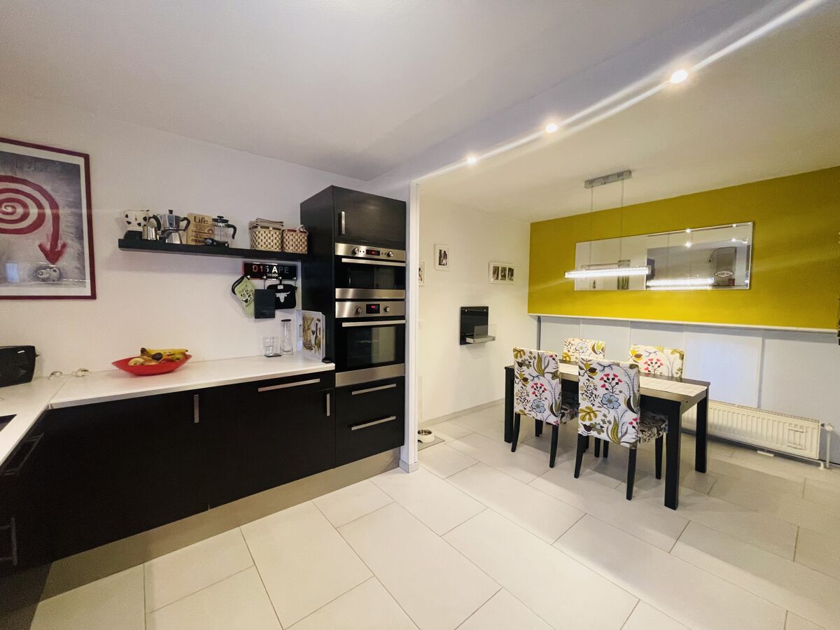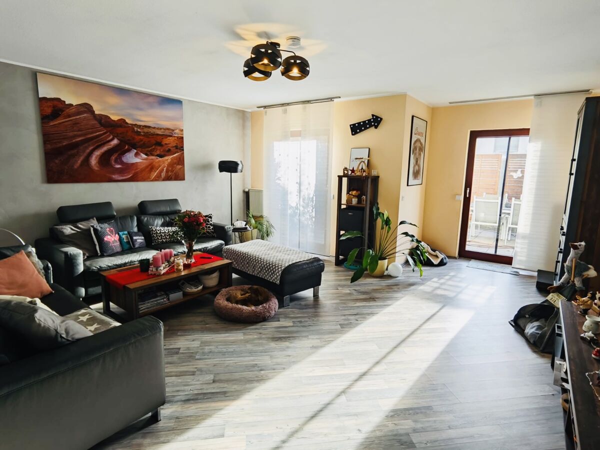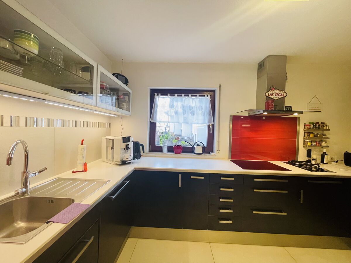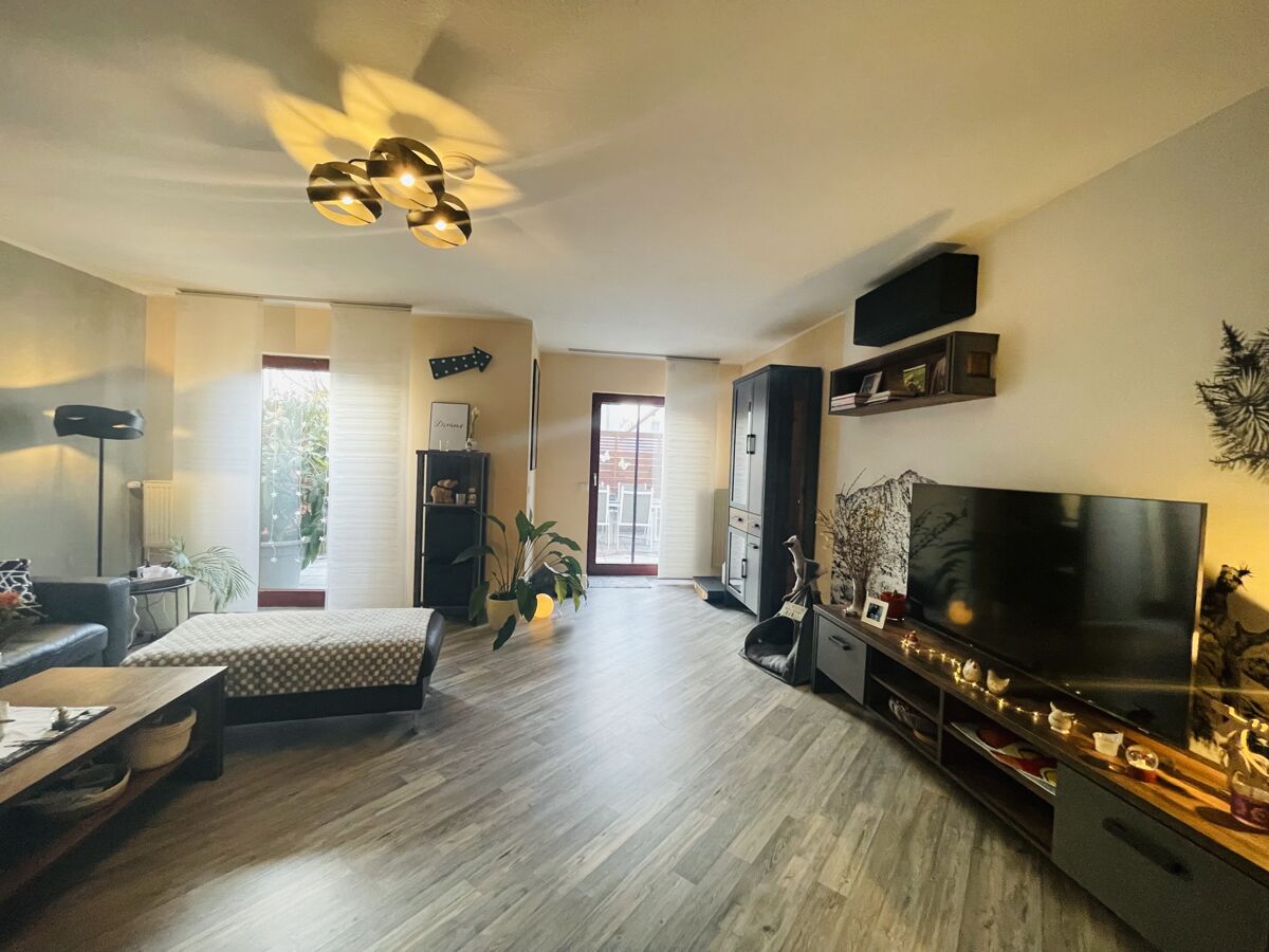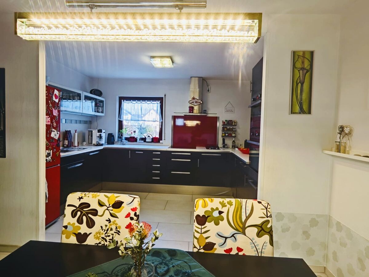 Vom Wohnzimmer aus gelangt man ebenerdig auf die Terrasse. Dadurch besteht insbesondere in den Sommermonaten eine kurze und direkte Verbindung in den eigenen, pflegeleicht angelegten Gartenbereich. Die Terrasse eignet sich für einen Sitzplatz mit Blick ins Grüne. Ebenfalls großzügig wirkt die Küche mit integriertem Essbereich, in der sich ein Esstisch gut unterbringen lässt. So entsteht ein eigenständiger Essplatz, der sowohl für den Alltag als auch für kleinere Runden mit Besuch praktikabel ist.