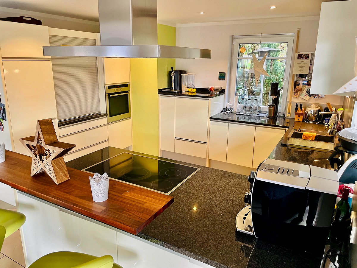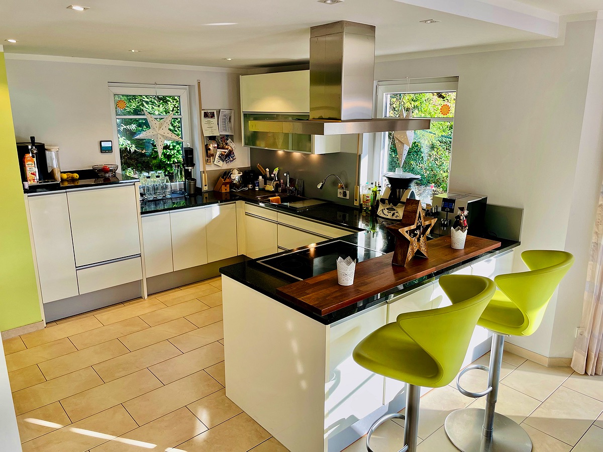 Das Haupthaus bietet rund 190 m² Wohnfläche und besticht durch eine großzügige, durchdachte Raumaufteilung sowie helle, repräsentative Räume. Der offen gestaltete Wohn- und Essbereich bildet das Herzstück des Hauses und führt direkt auf die wundervolle Terrasse, von der aus sich ein weiter Blick in die umliegende Natur eröffnet. Harmonisch in den Wohnbereich integriert befindet sich die hochwertige, werthaltige Einbauküche der renommierten Marke LEICHT, die mit zeitlosem Design, exzellenter Verarbeitung und hoher Funktionalität überzeugt und den gehobenen Anspruch dieser Immobilie unterstreicht.